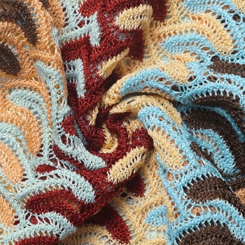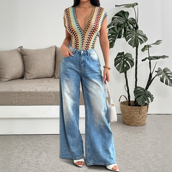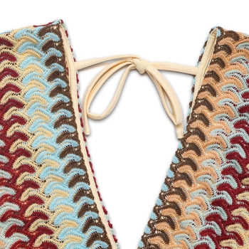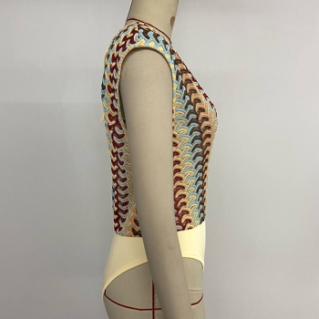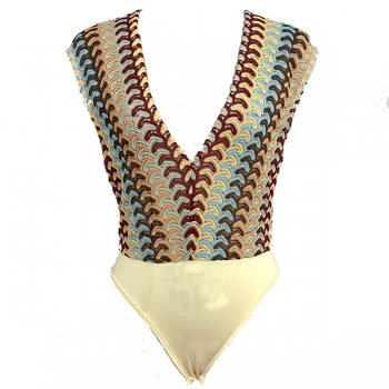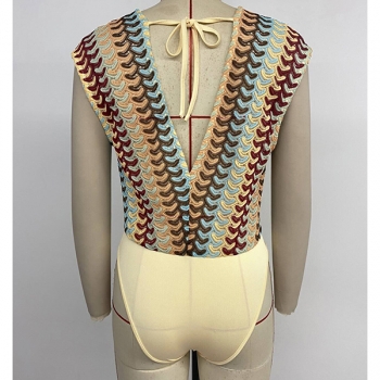 Retro 70-tals bohemisk body, flerfärgad vågmönster, öppenstickad med djup V-ringning och kepsärm