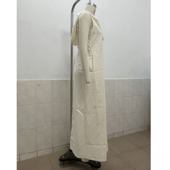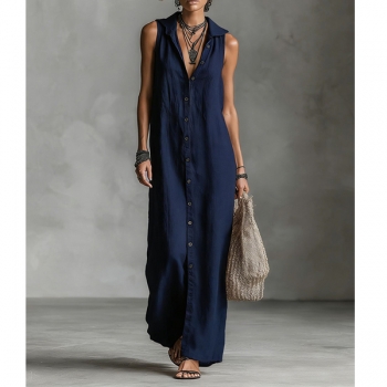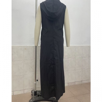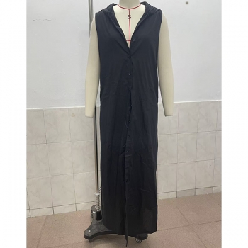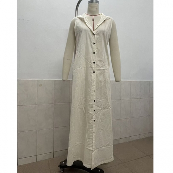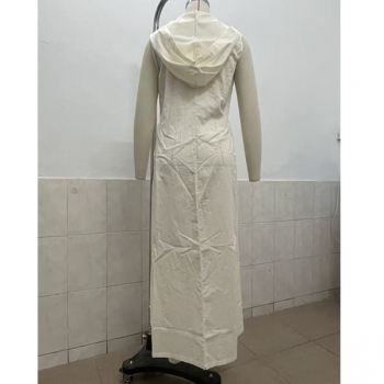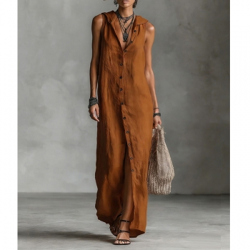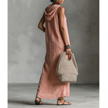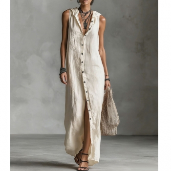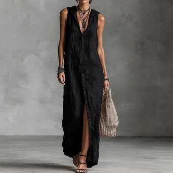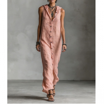 Bohochic Ärmlös Sommarklänning med Knäppning, Huva och Avslappnad Passform