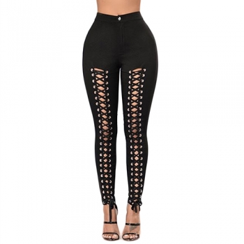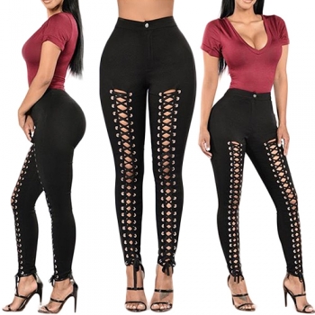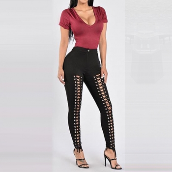 Sexy High Waist Hollow Out Lace-up Solid Color Leggings