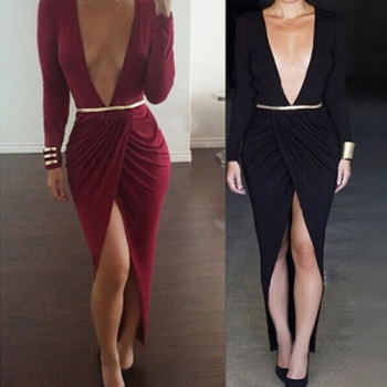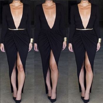 Långärmad festklänning med sexig djup v-ringning och slitsad fåll