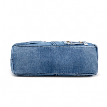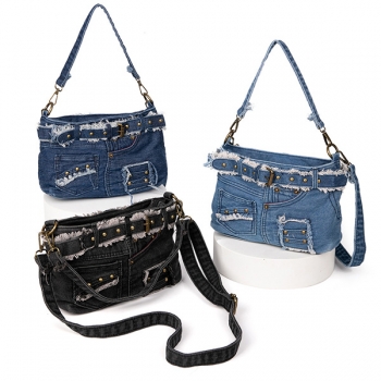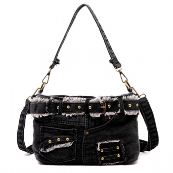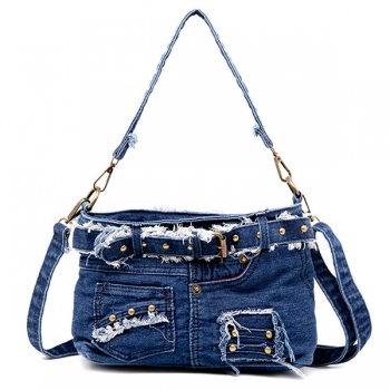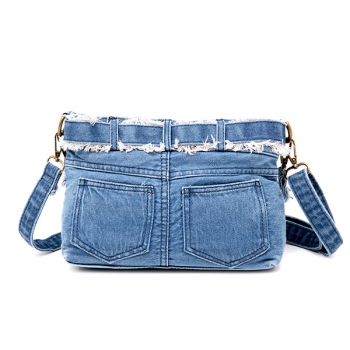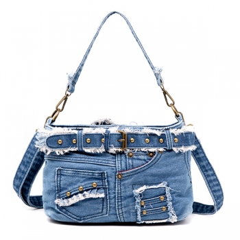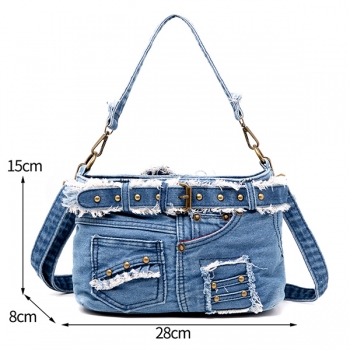 Denimväska med dekorativt bälte: Damhandväskor fickutformning