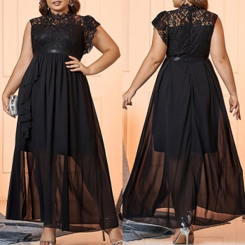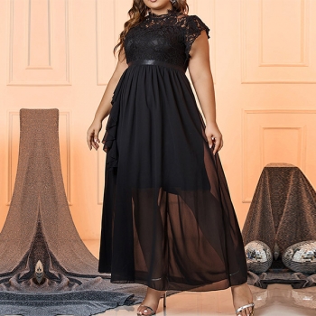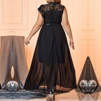 Elegant mock hals ärmfri spetsfäst chiffong Plus-storlek klänning