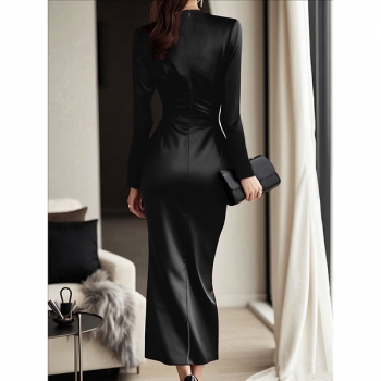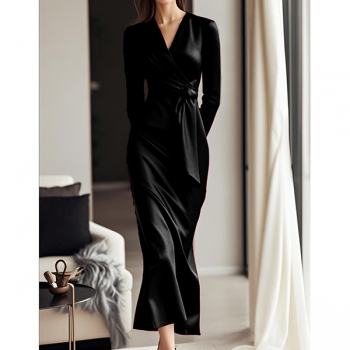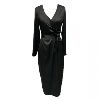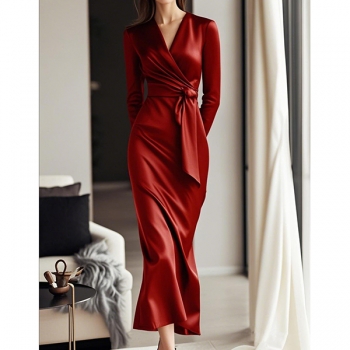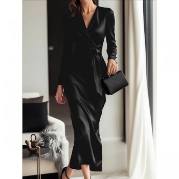 Satinklänning med V-ringning, långärmad och knytdetalj – elegant festklänning