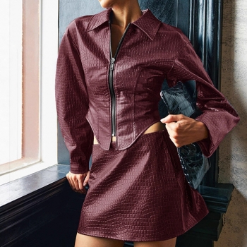 Trendigt tvådelat PU‑konstläderset – kort jacka med asymmetrisk fåll och minikjol