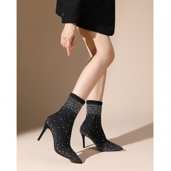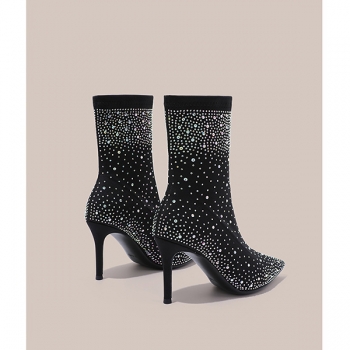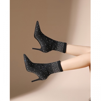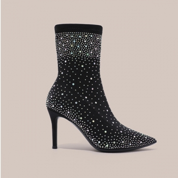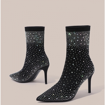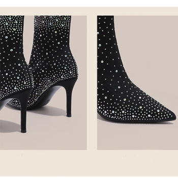Högklackade rostfärgade ankelstövlar med spetsig tå och blingdetaljer