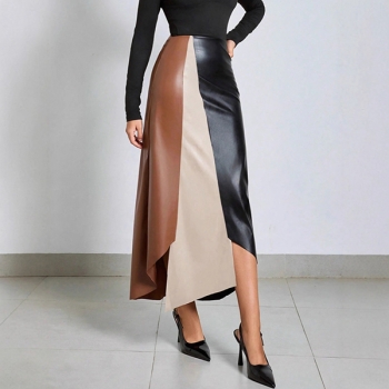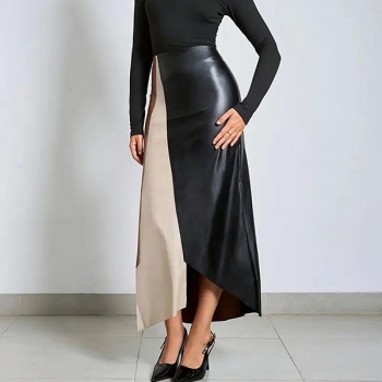 Högmidjad kjol i konstläder med kontrastfärger, PU-detaljer och asymmetrisk fåll