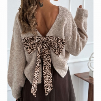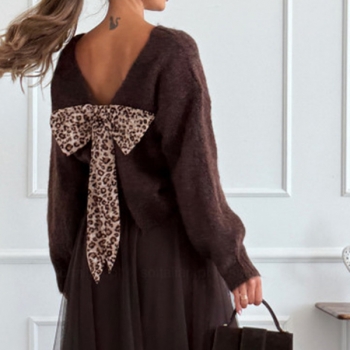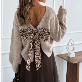 Klänning, trendig rund halsringning, lång ärm, ryggfri med leopardmönster och rosett