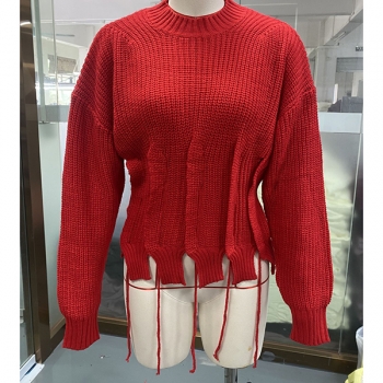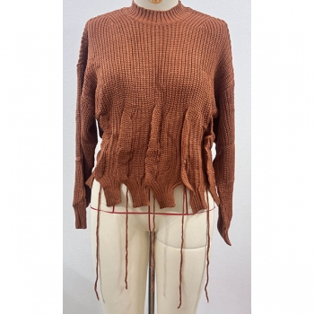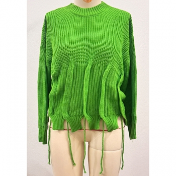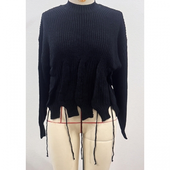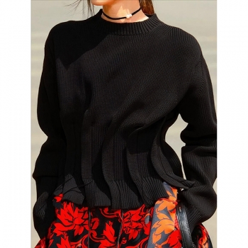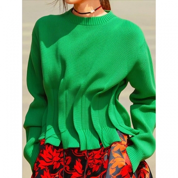 Stickad damtröja med rund hals, långärmad och veckad detalj – trendig