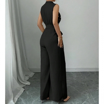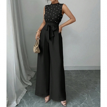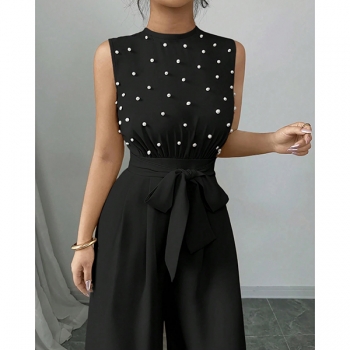 Jumpsuit med rund halsringning, ärmlös, pärlbesättning vid halsen, hög midja med knytband och vida ben