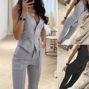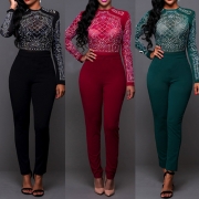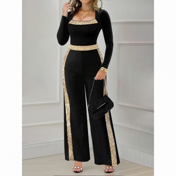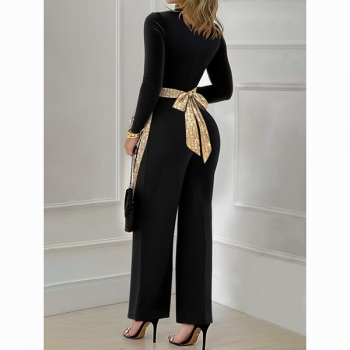 Jumpsuit – trendig guldfärgad och svart med kontrast, fyrkantig halsringning, långärmad, hög midja med knytdetalj och rak passform