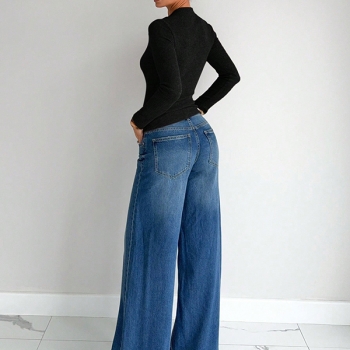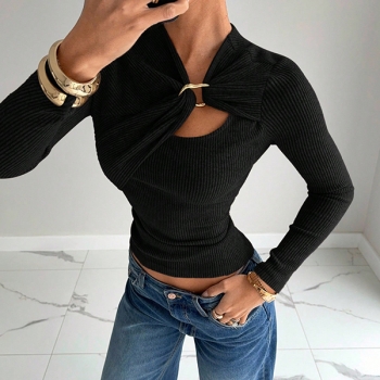 Ribbad långärmad topp med asymmetrisk halsringning och utskärning fram