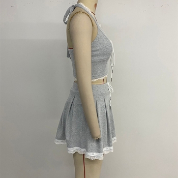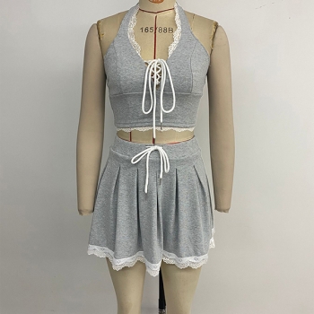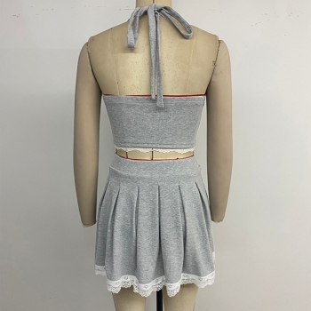 Trendigt tvådelat spetsset med halterneck-topp och plisserad minikjol