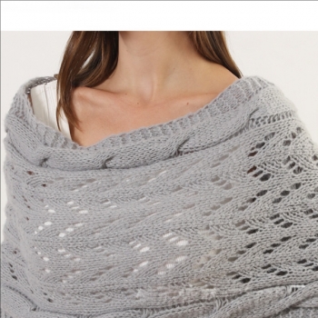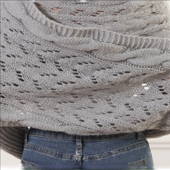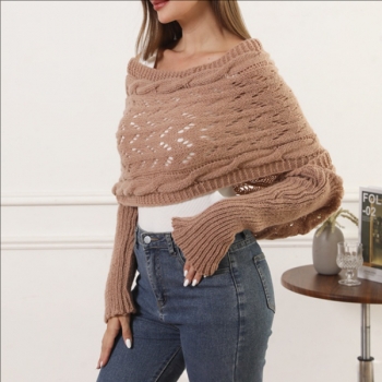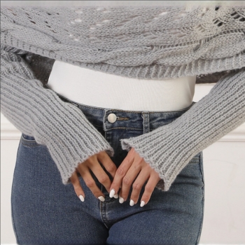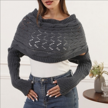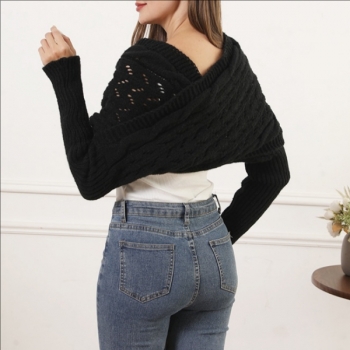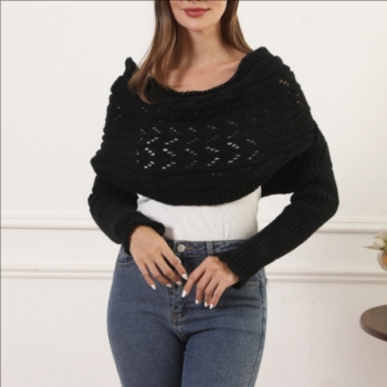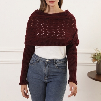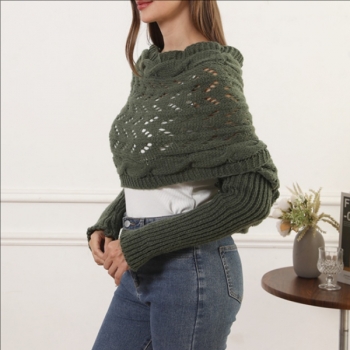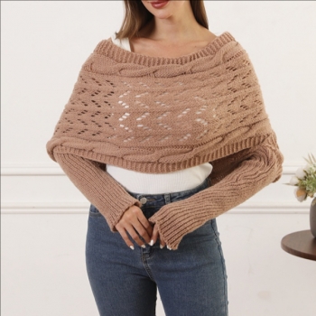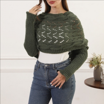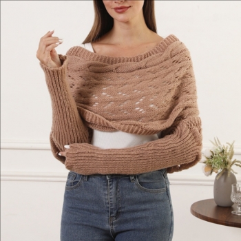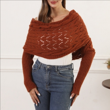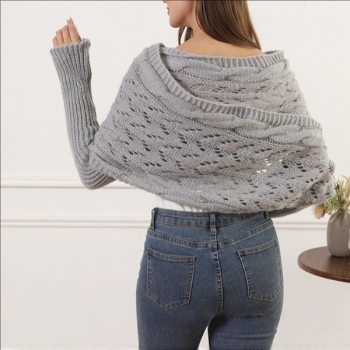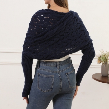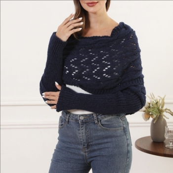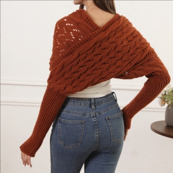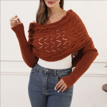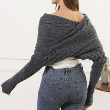 Trendig öppenstickad långärmad tröja med halsduk och omlottsydd axelbandsdetalj för dam