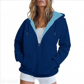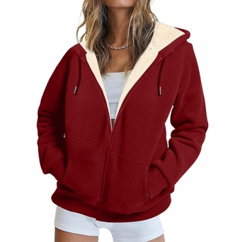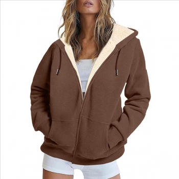 Sweatjacka för dam med plyschfoder, huva med dragsko och långärmad, trendig