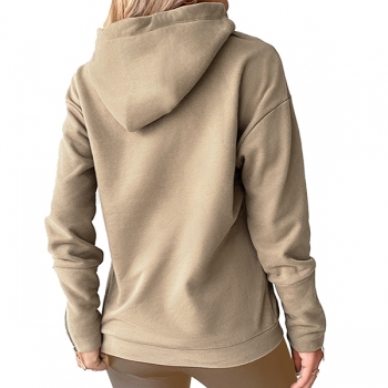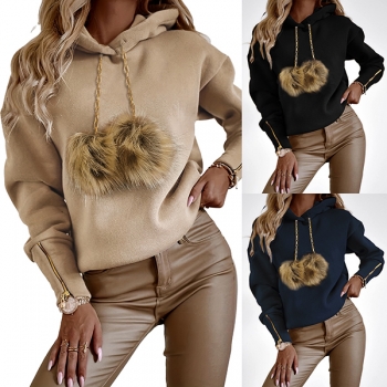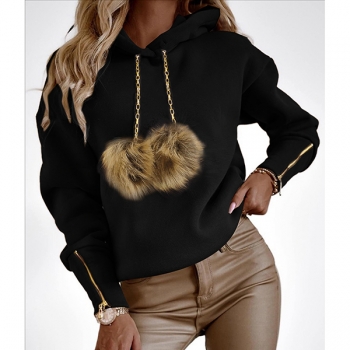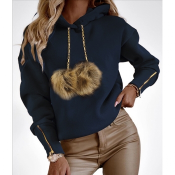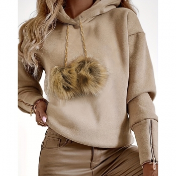 Trendig damhoodie med pompom och kedjedetalj, långärmad med dragkedja