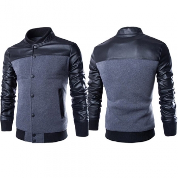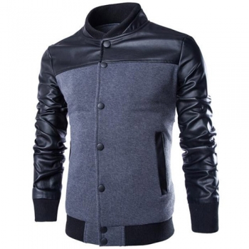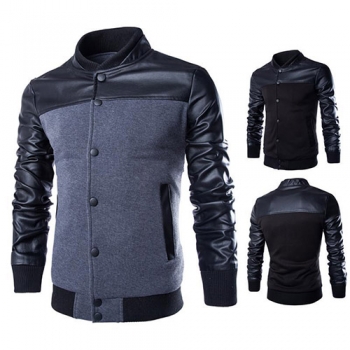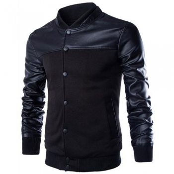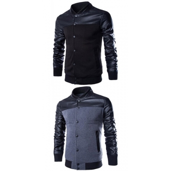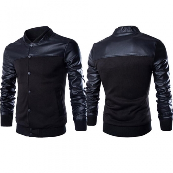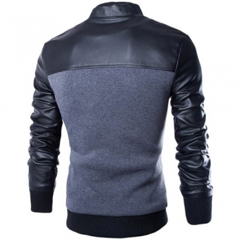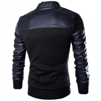 Fashion PU Leather Spliced Long Sleeve Stand Collar Men's Jacket