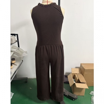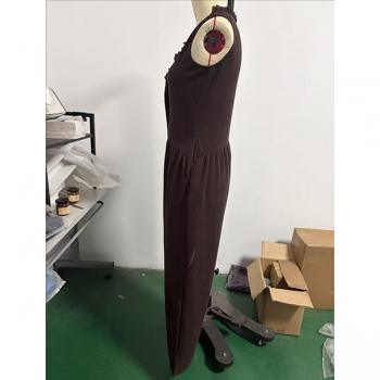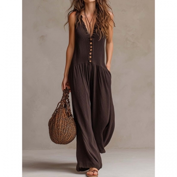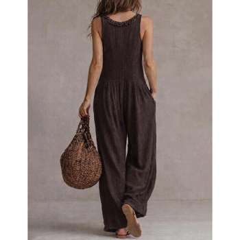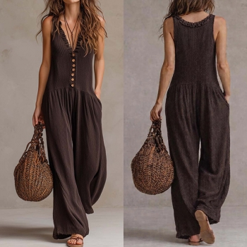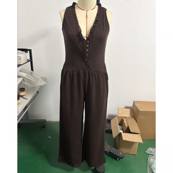 Modernt ärmlöst jumpsuit med volang, V-ringning, vida ben och strukturerat tyg
