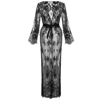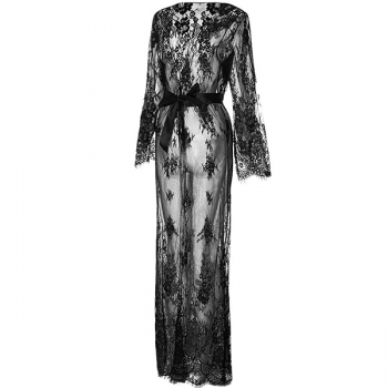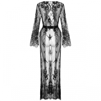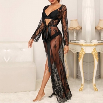 Mode halvgenomgående spets Nattkläder i två delar med lång spetsrock och bälte