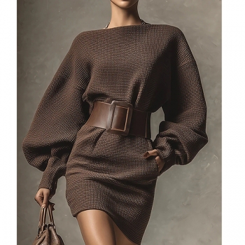 Stickad tröjklänning med asymmetrisk axeldetalj, fladdermusärmar och midjebälte