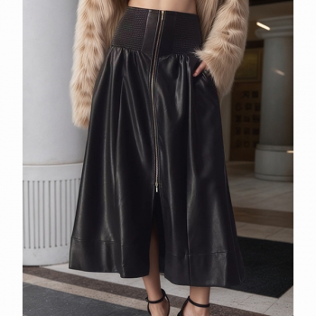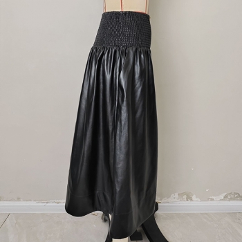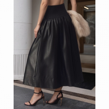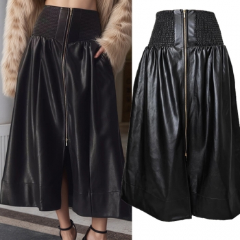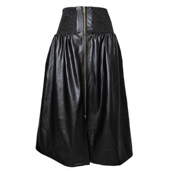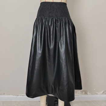 A-linjekjol i konstläder med smockad midja, framdragkedja och slits – PU-fodrad