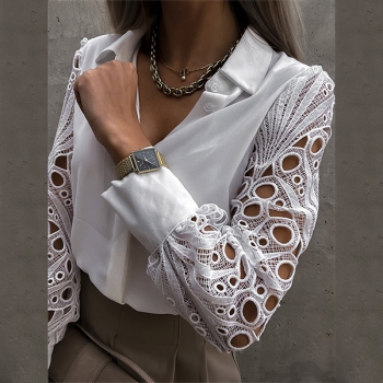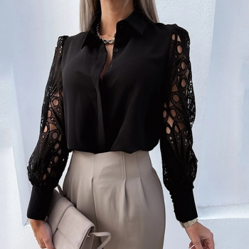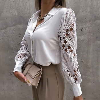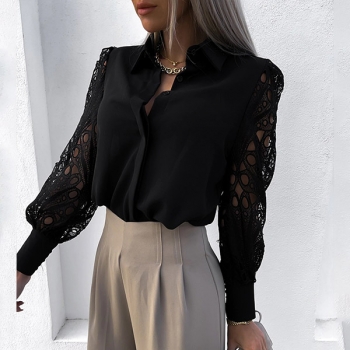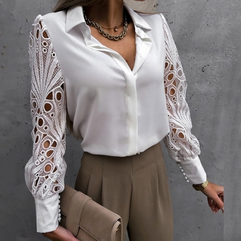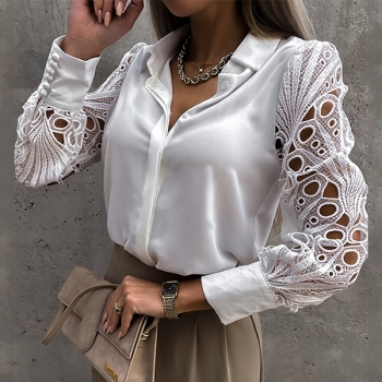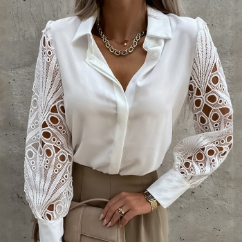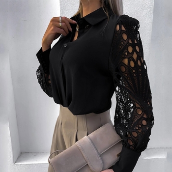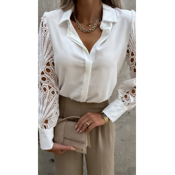 Trendig enfärgad blus med spetsdetaljer, lång ärm och V-ringning