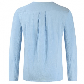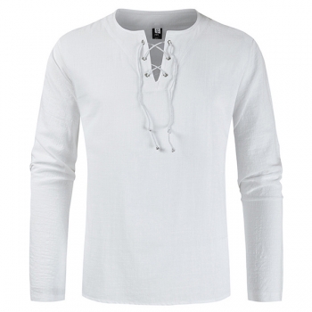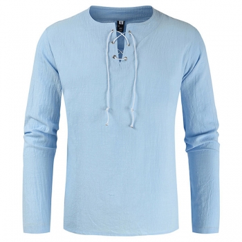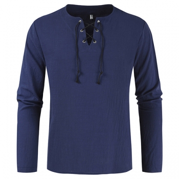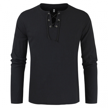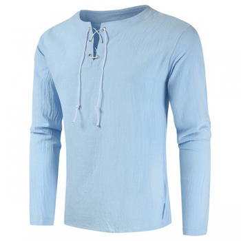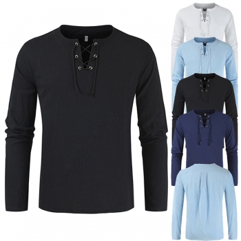 Fashion Solid Color Long Sleeve Lace-up V-neck Men's T-shirt