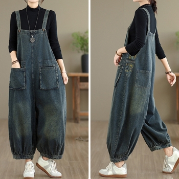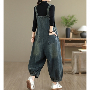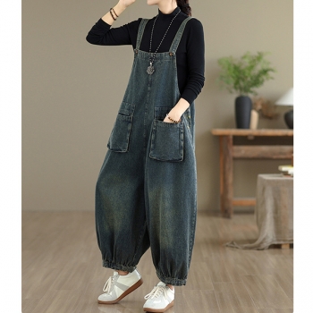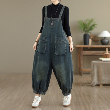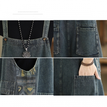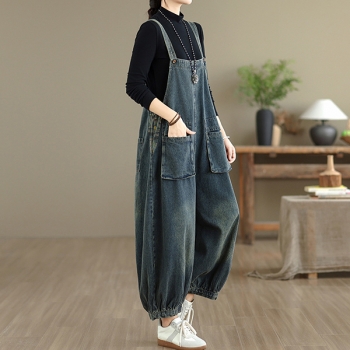 Trendigt denimjumpsuit med fyrkantig halsringning, påsydda fickor och löst hängsel-snitt i vintage tvätt