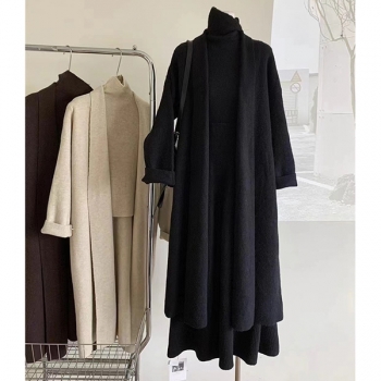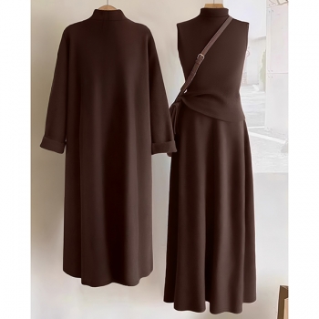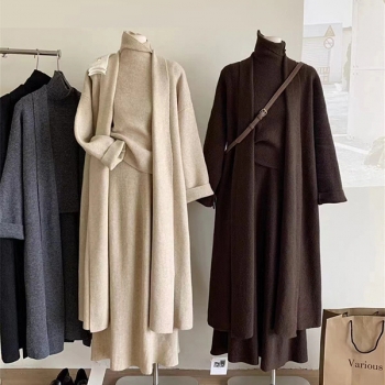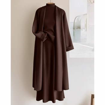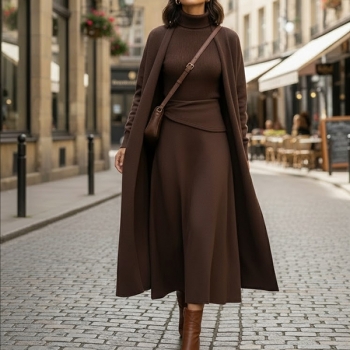 Trendigt 3-delat damset: ärmlös topp med hög halsringning, midikjol och kofta