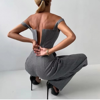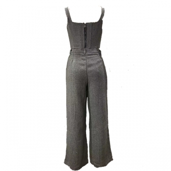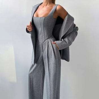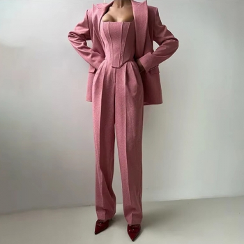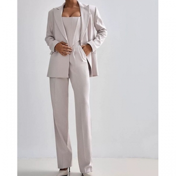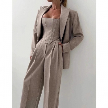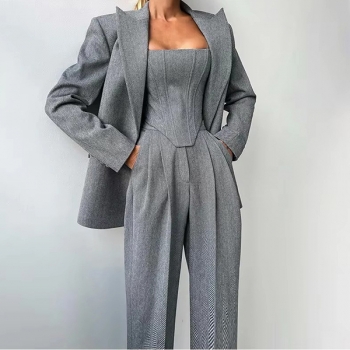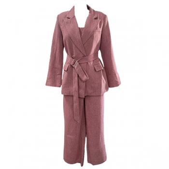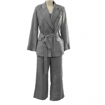 Trendigt 3-delat kostymset med croppad topp, raka byxor och kavaj med bälte