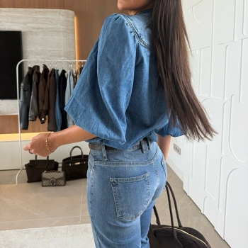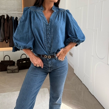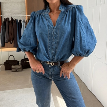 Dam trendig V-ringad jeansskjorta med knappar fram och armbågslånga ärmar