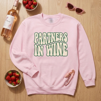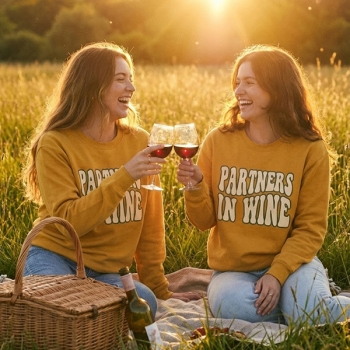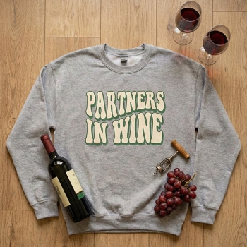 Damtröja Partners in Wine – Retro vågigt tryck, rund hals – Roliga matchande bästis-tröjor – Present till systrar för vinprovning och vingårdsbesök