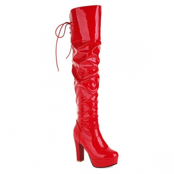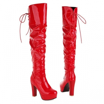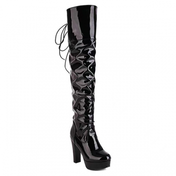 Stövlar över knät i lackläder med rynkad detalj och stilettklack