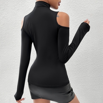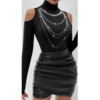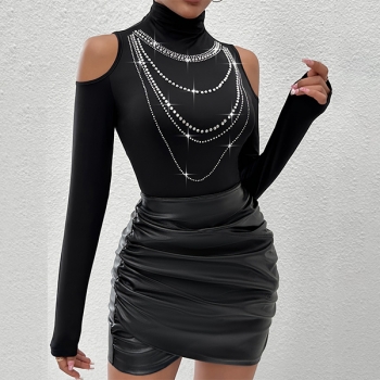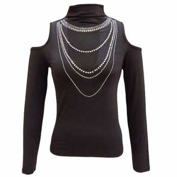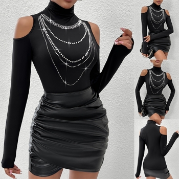 Sexig Glittrande Strass Tofs Polokrage Långärmad Tröja med Öppen Axel