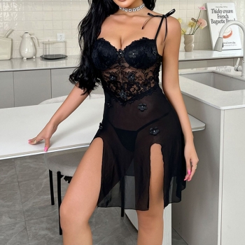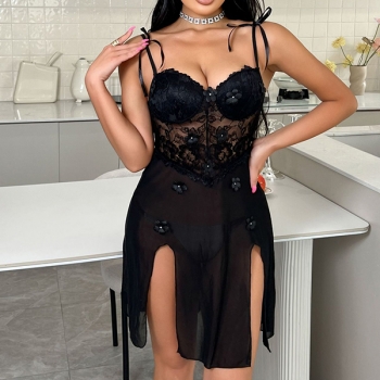 Sexig broderad 3D-blomdekor Sweetheart Neckline Spets Slits Chiffong Nattklänning