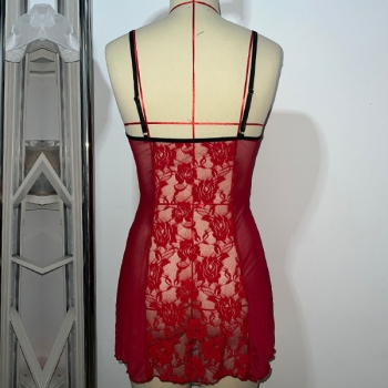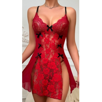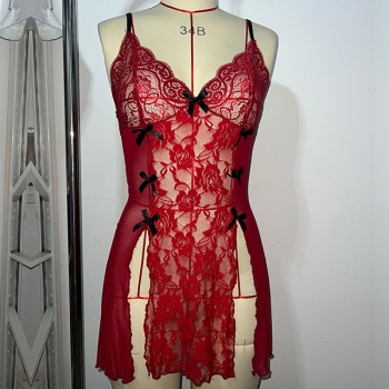 Sexig halvgenomgående nattklänning med bowknot och spetsklänning