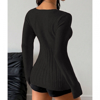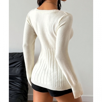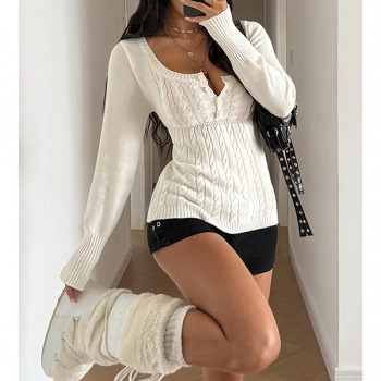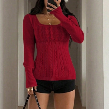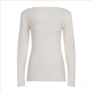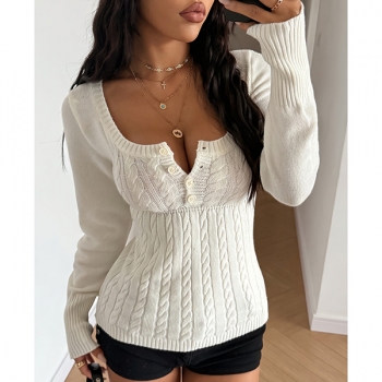 Kabelstickad, långärmad pullover med sexig fyrkantig ringning – slim fit med knappar fram