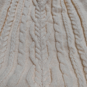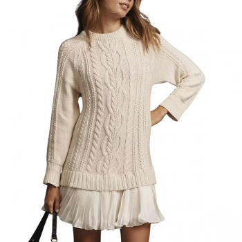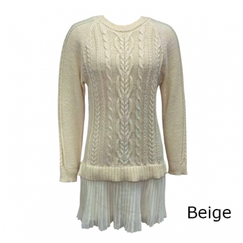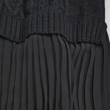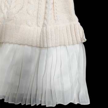 Moderiktig rund halsringning, långärmad chiffongklänning med skarvar och veckad fåll, kabelstickad tröja