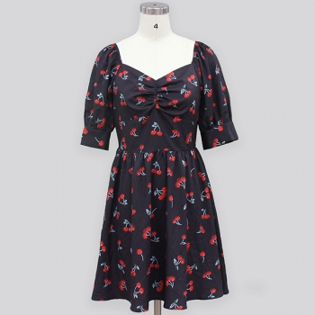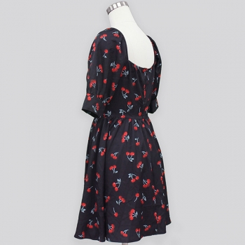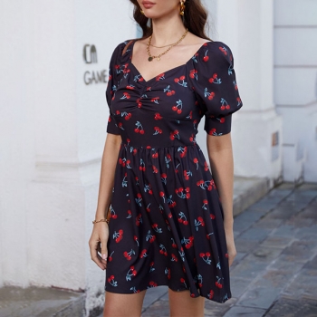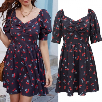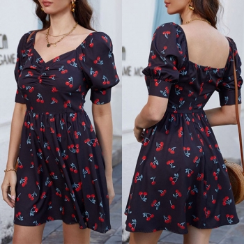 Söta rygglösa V-ringade klänningar med puffärm och hög midja - körsbärstryck