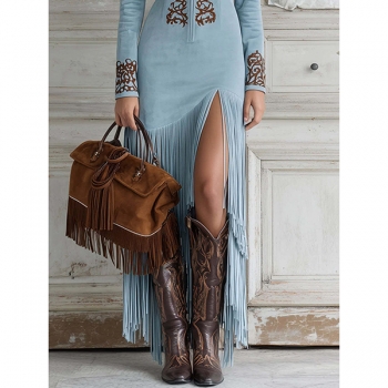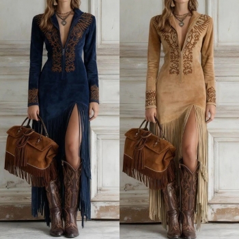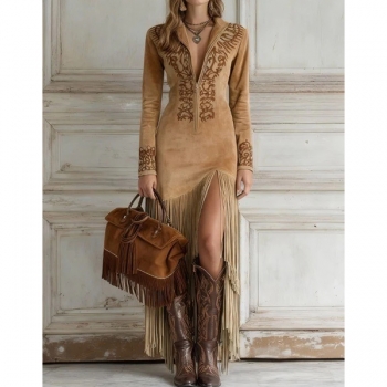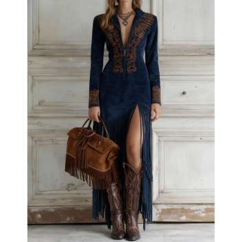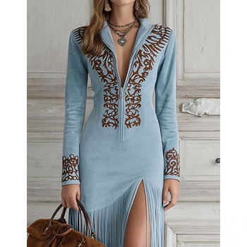 Vintage blommig broderiklänning med halvdragkedja, V‑ringad, långärmad och tofsad fåll