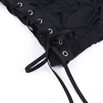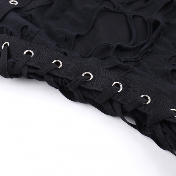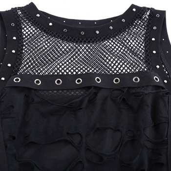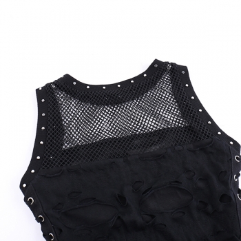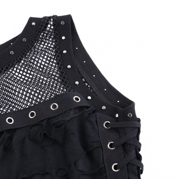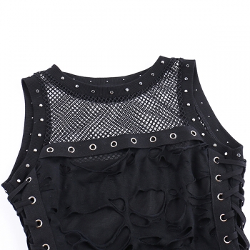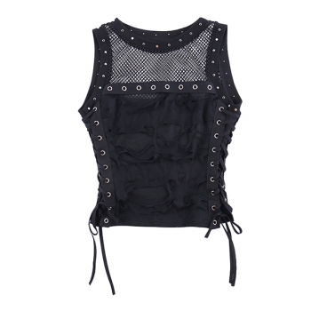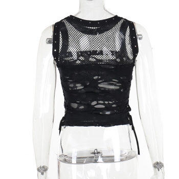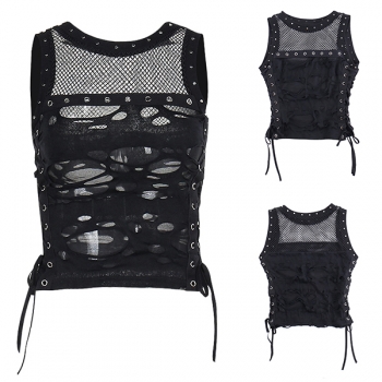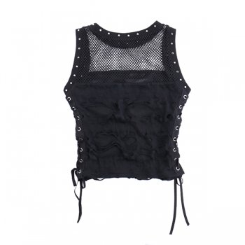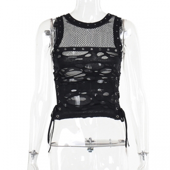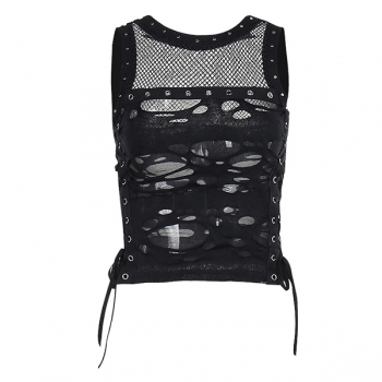 Vintage ärmlös skjorta med fyrkantig halsringning och fisknätsmönster, snörning i sidan