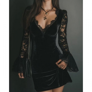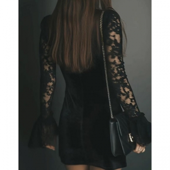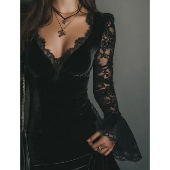 Damminiklänning i sammet, vintageinspirerad – v-ringning, transparenta spetsärmar och utsvängda manschetter
