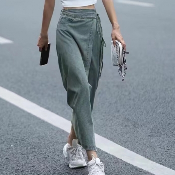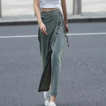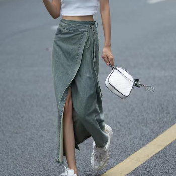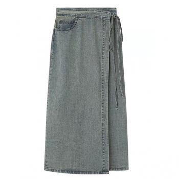 Denimmaxikjol vintagefärgad – högmidjad omlottkjol med slits på sidan, Y2K grunge