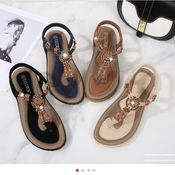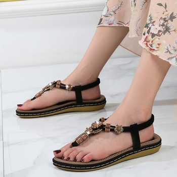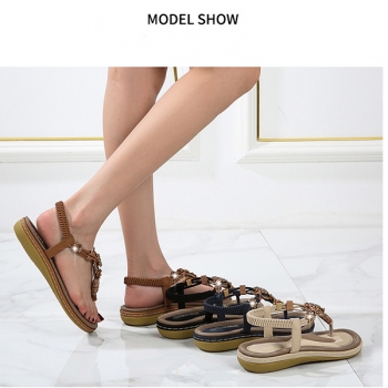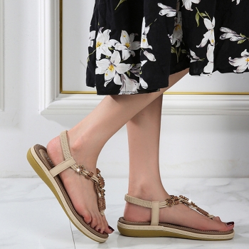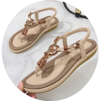 Damsandaler Boho pärlprydda, platta och bekväma sommarstrandskor med blommönster, T‑rem och elastisk ankelrem