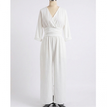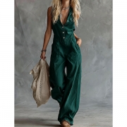 Dam Boho-jumpsuit med vida ben och fickor – V-ringad, fladdermusärm, hög midja, sommarjumpsuit