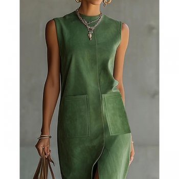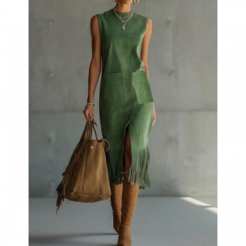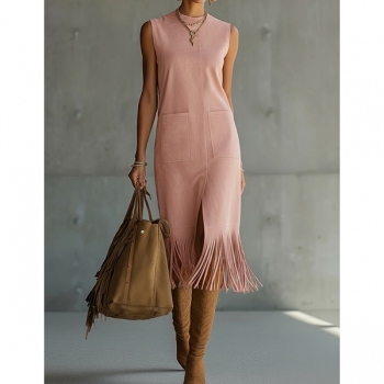 Damklänning i konstmocka med fransar, ärmlös med rund halsringning – boho-westernklänning med fickor