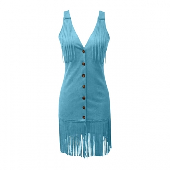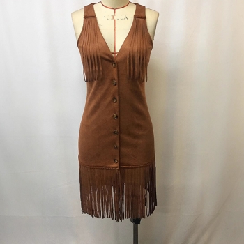 Damklänning i konstmocka med fransar – boho Western-miniklänning med tofsar och V-ringning