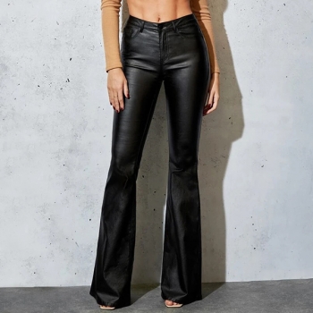 Dambyxor – högmidjade, utsvängda byxor i konstläder (stretchig PU) – slim fit bootcut