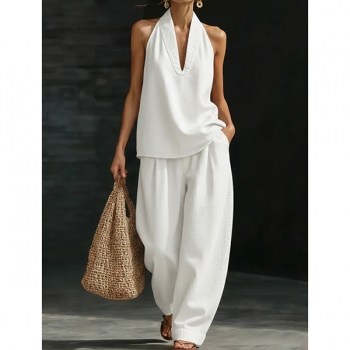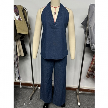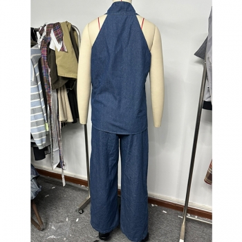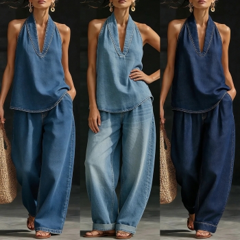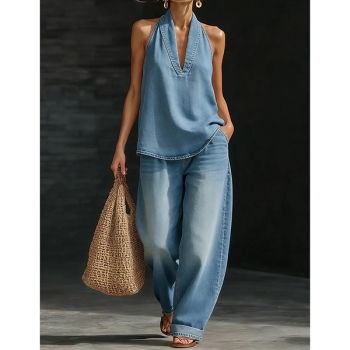Denimset i två delar – ärmlös halterneck-topp med V-ringning och matchande vida byxor