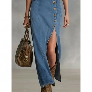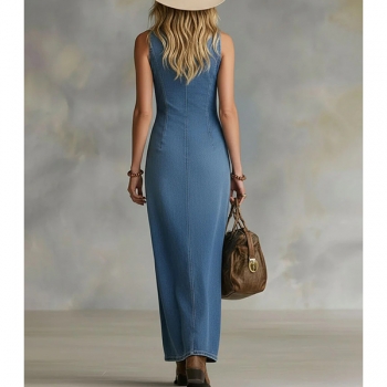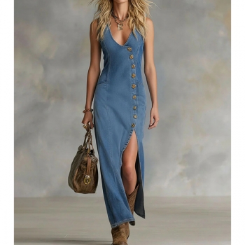 Vintage midi-denimklänning för dam med krage – ärmlös V-ringning, asymmetrisk knappslå och slits